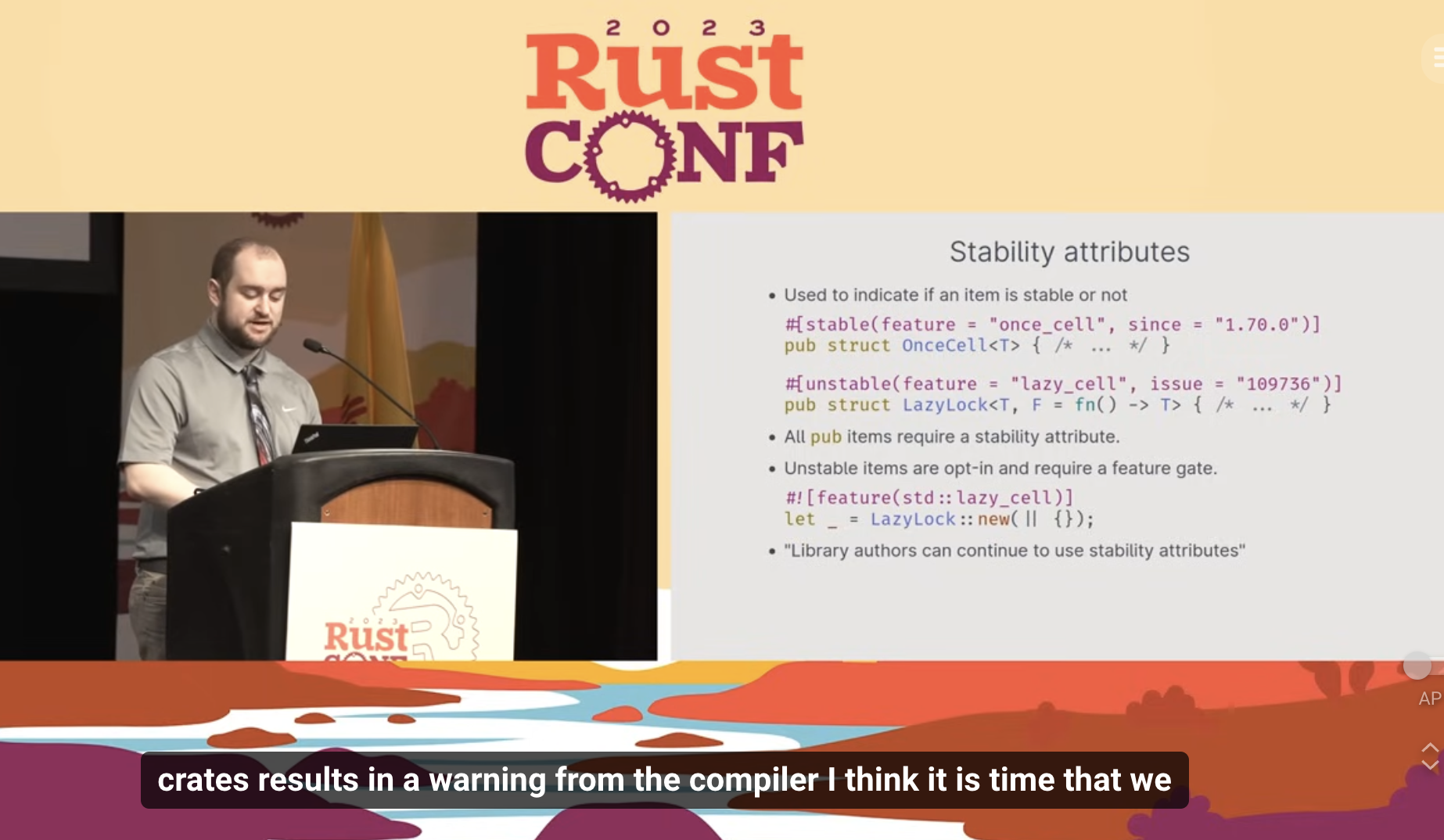稳定性属性在Rust世界中已经存在很长时间了。2014年10月,在一篇官方博客文章中说,库作者可以继续使用稳定性属性。自那以后已经过去了将近9年,然而与那篇文章相反,稳定性属性目前明确仅用于标准库。尝试在其他crate中使用它们会导致编译器发出警告。我认为是时候最终为每个人提供这个功能了,因为我们知道它非常有用。