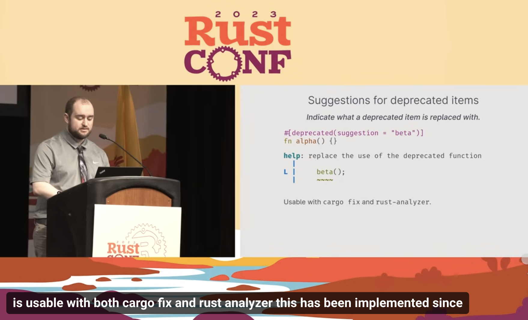 deprecated属性在Rust 1.0发布后约一年就稳定了,但rust_c_deprecated仍然存在。这种情况一直持续到2022年3月,当时我完全合并了这两个属性的前端,此时功能几乎相同。我说几乎是因为仍然有一个区别,那就是对已弃用项的建议。这允许作者指出一个已弃用的项被什么替换了。目前,这必须通过note字段完成,这需要最终用户阅读并手动去进行更改。在这个例子中,alpha字段已被弃用,转而使用beta。这通过一个新的suggestion字段表示,并提供建议。编译器将产生更好的诊断信息。它将清楚地显示对Alpha的调用必须替换为beta。顺便说一下,这个建议是机器可应用的,所以它可以与cargo fix和rust analyzer一起使用。这个功能自2019年1月就已实现,当时它是rust_c_deprecated属性的一部分。当它与deprecated合并时,该功能在nightly上对所有人开放,这就是它目前的状态。
