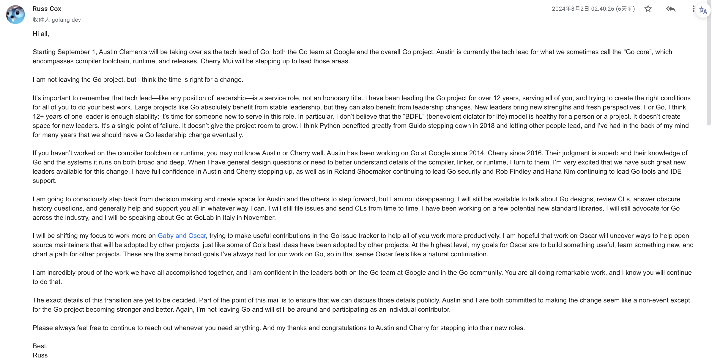 6天前,掌舵Go语言团队12年Rsc在golang-dev/群组发文宣布,将在9月1号后辞去当前职位,转去做 Gaby 和 Oscar. 这对于Go语言发展无疑是里程碑式的事件。