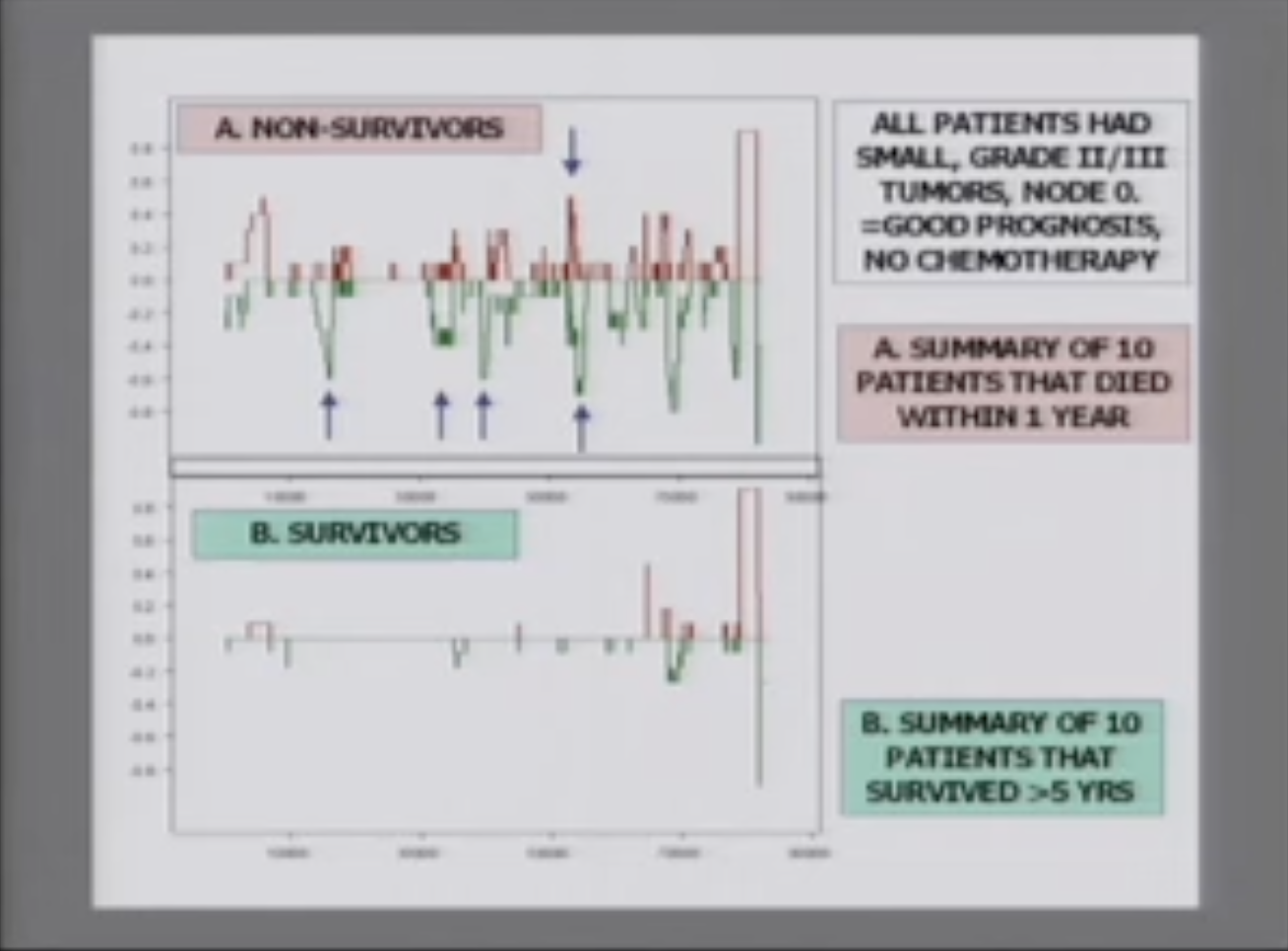 你可以做的是比较正常组织与癌症的DNA。你可以在顶部看到,不好的癌症显示插入或缺失。所以DNA真的被严重破坏了,而如果你有生存的机会,DNA就没有那么乱。