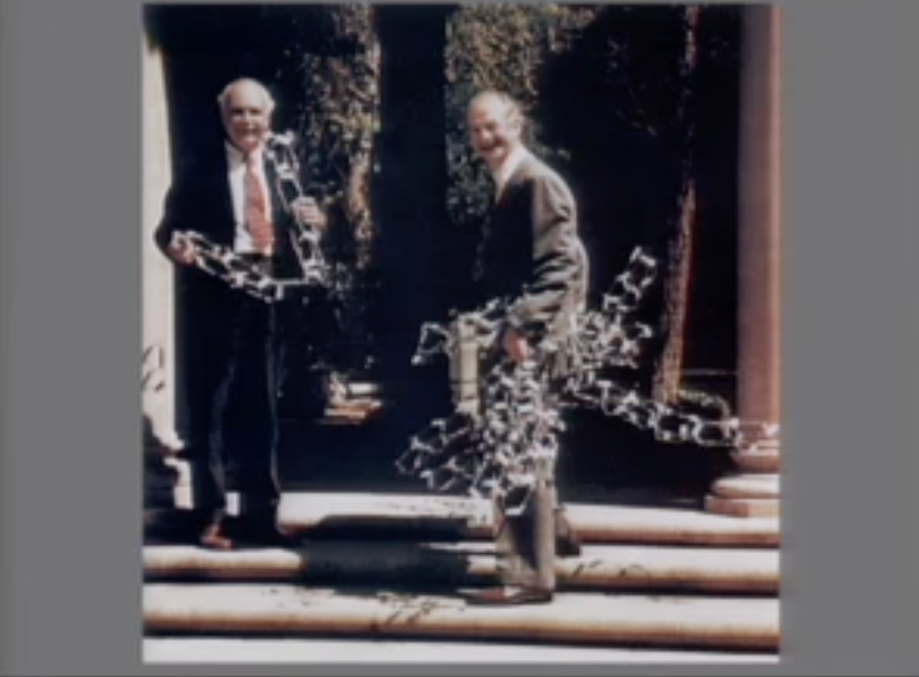 处在这张照片中心位置的人, 是莱纳斯·鲍林。大约六个月前,他提出了蛋白质的α螺旋结构。在这样做时,他让右边的那个人,劳伦斯·布拉格爵士,卡文迪许教授,很难堪。这是几年后的照片,布拉格有理由微笑。当我到那里时,他肯定没有笑,因为鲍林得到了α螺旋,而剑桥人失败了,这让他有些羞愧,因为他们不是化学家。当然,克里克和我都不是化学家,所以我们试图建立一个模型。他知道,弗朗西斯认识威尔金斯。