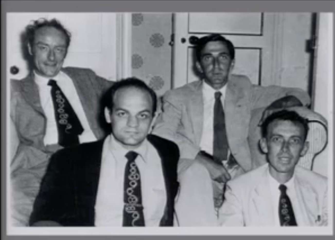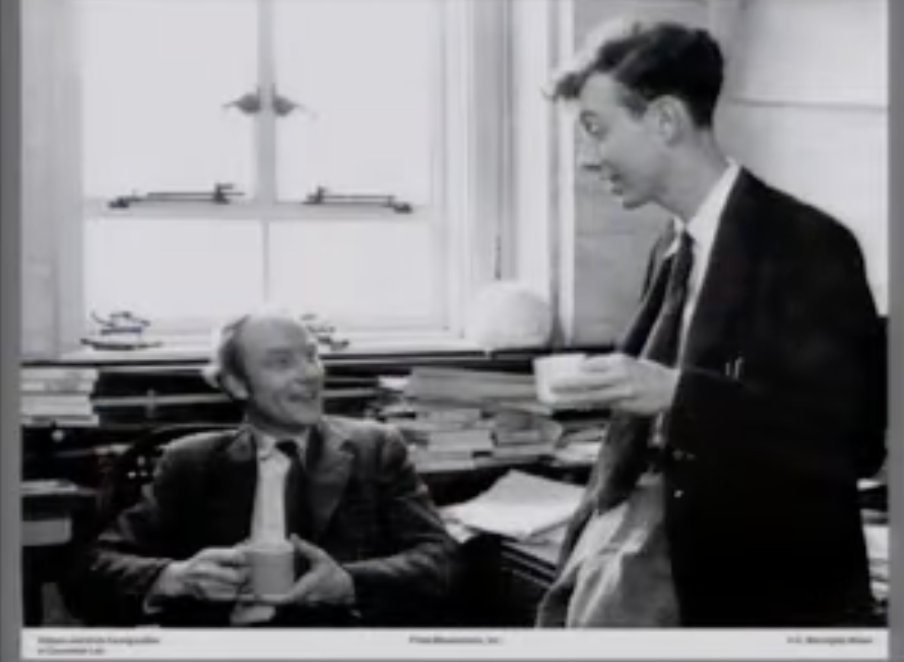 但那是唯一的——不,我们只拍了两次照片。在两个场合,你知道,我们中的一个没有戴领带。弗朗西斯在右上方,亚历克斯·里奇——从医学博士转为晶体学家——在我旁边。这是1955年9月在剑桥拍的。我在微笑,我想是强颜欢笑,因为我爱的那个女孩,天哪,她走了。(笑声)