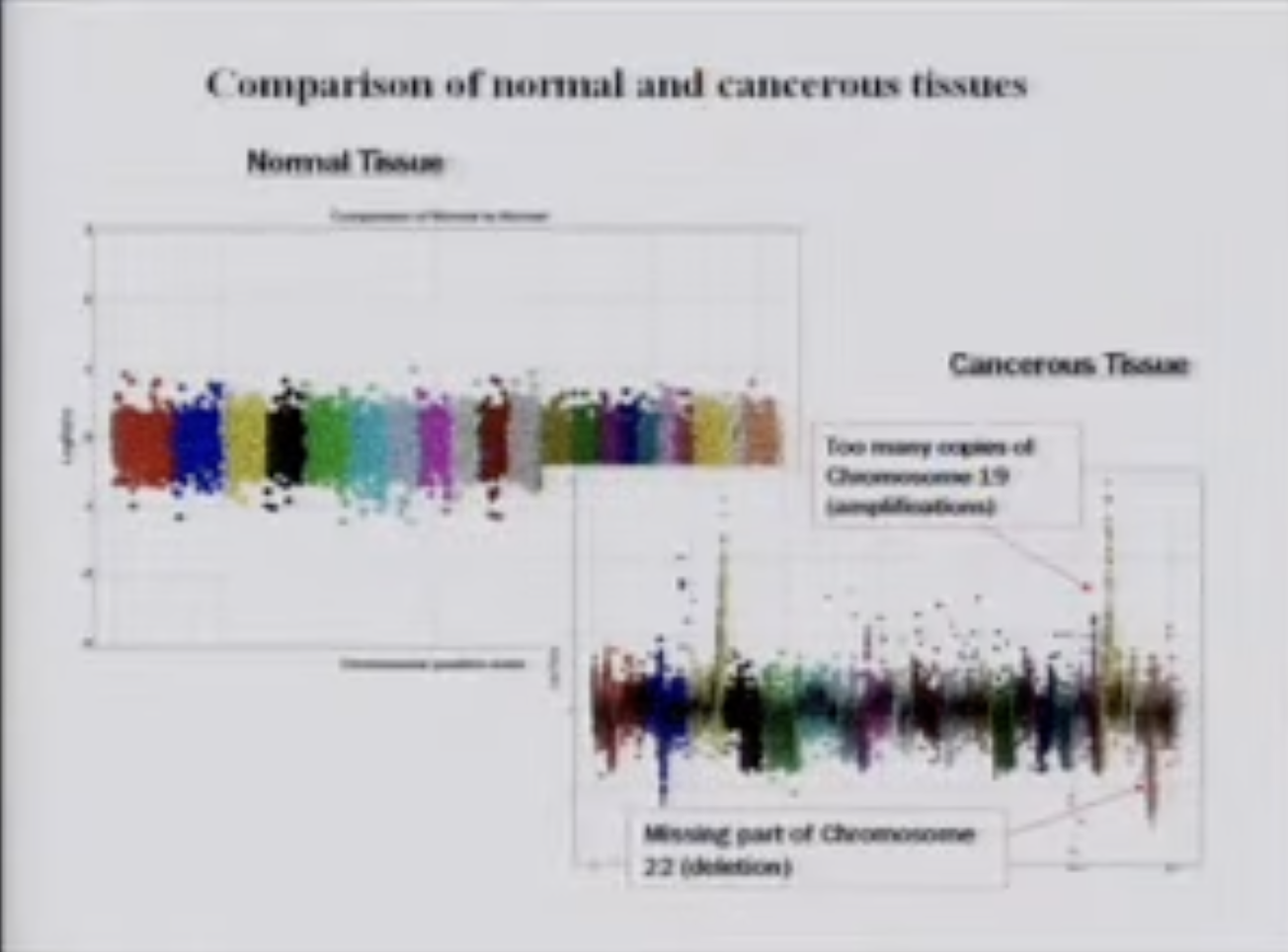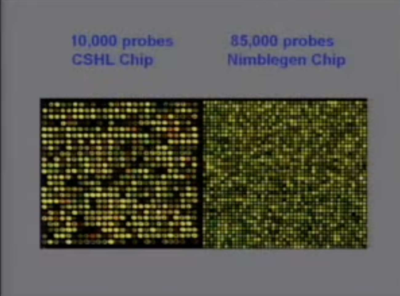 所以我继续。我已经超时了,但这是迈克尔·维格勒,一位非常非常聪明的数学家转物理学家。他开发了一种技术,基本上可以让我们查看样本DNA,最终沿着它有一百万个点。那里有一个芯片,一个常规的。然后有一个由麦迪逊的一家叫NimbleGen的公司通过光刻技术制造的,它远远领先于Affymetrix。我们使用他们的技术。