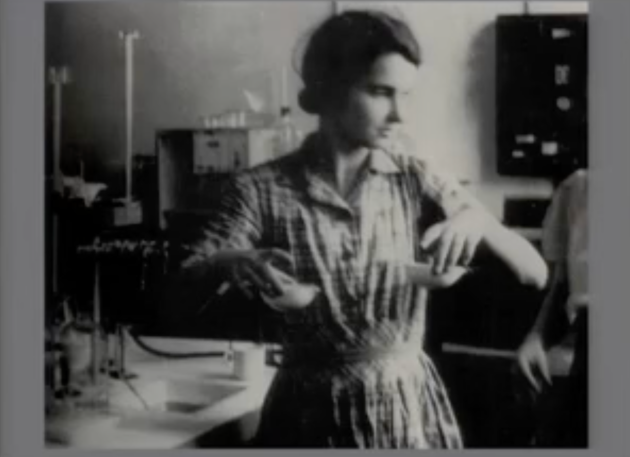 这是罗莎琳德的照片。她真的,你知道,从某种意义上说她是化学家,但实际上她接受的训练——她不懂任何有机化学或量子化学。她是晶体学家。我认为她不想建模型的部分原因是,她不是化学家,而鲍林是化学家。