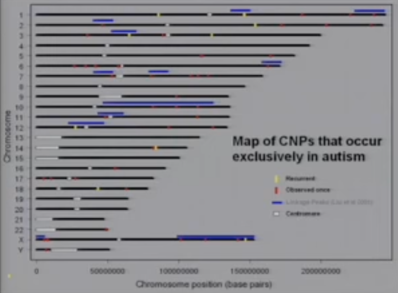 传统遗传学无法做到,但只是扫描它,我们开始发现自闭症基因。你可以在这里看到,有很多。所以很多自闭症孩子是自闭症,因为他们只是失去了一大块DNA。我是说,在分子水平上的大块。