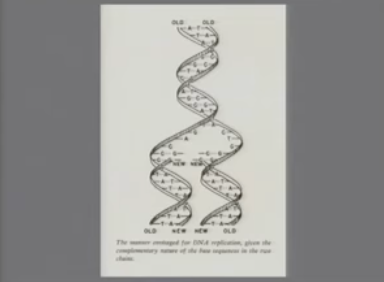 我们知道这很重要,因为,你知道,如果你只是把A放在T旁边,G放在C旁边,你就有了一个复制机制。所以我们看到了遗传信息是如何携带的。这是四个碱基的顺序。所以从某种意义上说,这是一种数字型信息。你通过链分离来复制它。