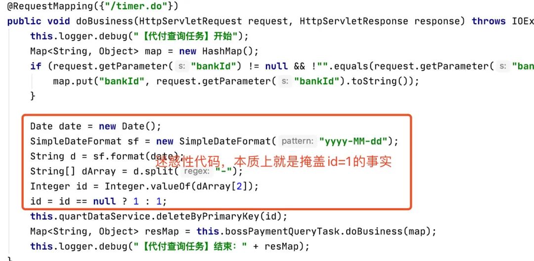 于是仔细阅读上述代码,发现上述红框中的代码无论何时执行最终的结果都是id=1。你是否看出来了?问题就出在三目表达式上,无论id是否为null,id被赋的值都是1。看到这里,也感慨对方是用心了。为了隐藏这个目的,前面写了那么多无用的代码。