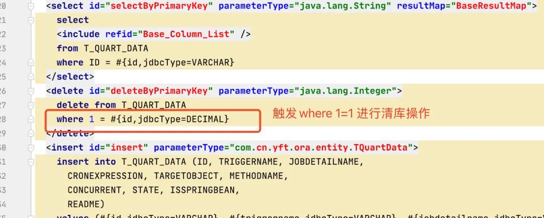 原来前面传递的id=1是为了配合where条件语句啊,当id=1被传递进来之后,就形成了where 1=1的条件语句。这个大家在mybatis中拼接多条件语句时经常用到。结果就是一旦执行了上述业务逻辑,就会触发删除T_QUART_DATA全表数据的操作。