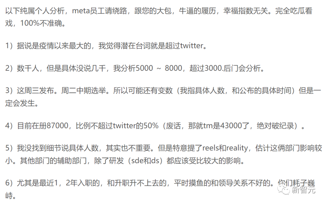 消息传来,就有吃瓜群众开始大胆猜测Meta本次裁员的一些细节,也就是小扎最近一个接一个声明背后的「画外音」。