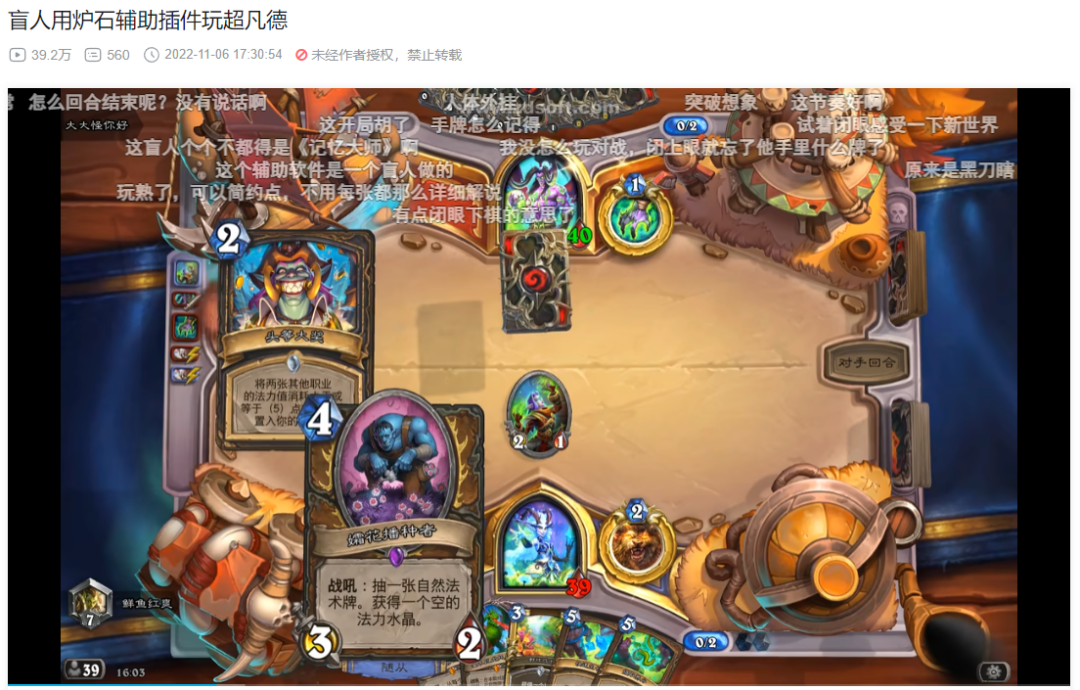 一经发布,就让不少听过炉石大名的视障玩家,体验到了在小酒馆打牌的乐趣。
