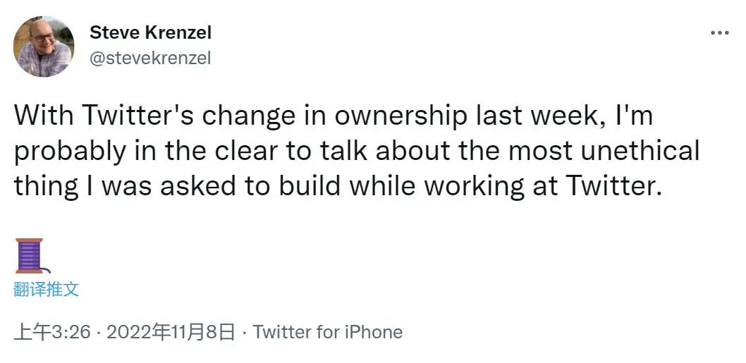 在各种对马斯克或谴责、或质疑、或支持的声音中,美国金融公司 Brex 首席工程师 Steve Krenzel 的一条推特引起了许多人的关注:“随着 Twitter 易主,我觉得我可以谈谈之前在 Twitter 工作时,我被要求构建的最不道德的东西了。”
