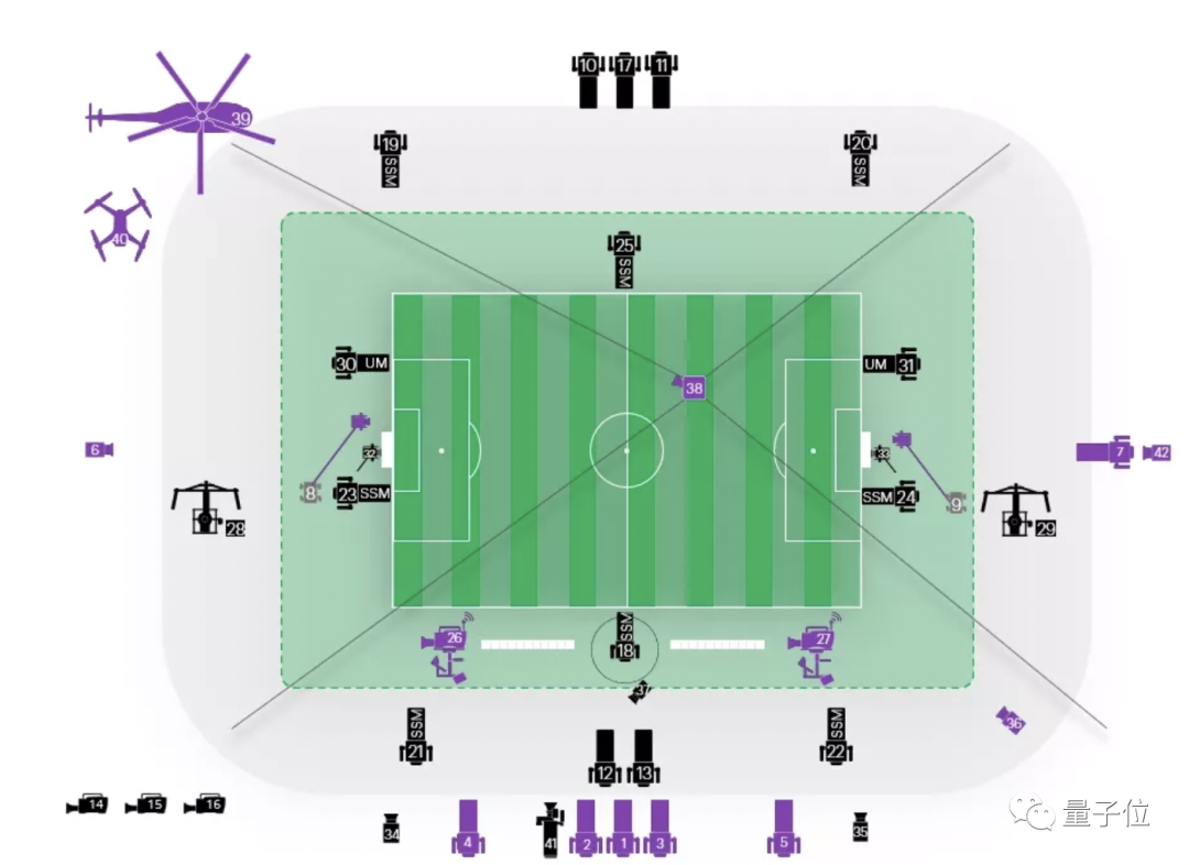 与此同时,球场上还安装了12个跟踪摄像头,一方面检测足球位置,另一方面还可以追踪每名球员身上的29个点,以此计算球员位置,每秒50次传输数据。