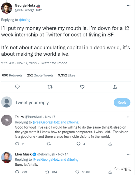 上周,Hotz在推特上表示支持马斯克对推特员工的提议(马斯克说,推特员工要么选择 「高强度长时间工作」,要么拿三个月工资的遣散费走人)。
