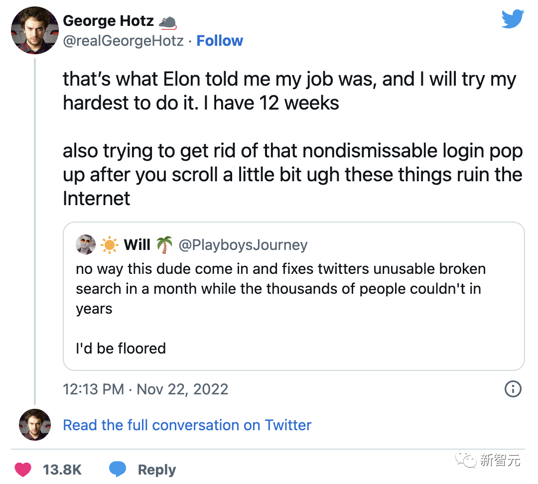 只是不知道,George Hotz这位大佬级实习生,在不在这次推特员工邮件的发送范围之内,要不要交周报。如果要,他的周报里又会写点什么呢。