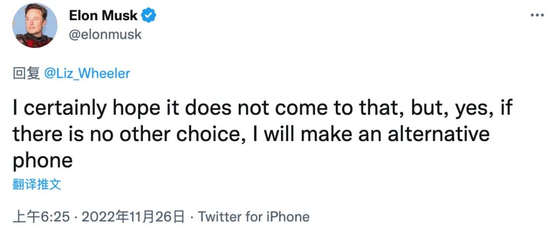在此之下,马斯克也出面回复道,“我当然希望事情不会变成那样,但是,是的,如果别无他选,我会制作一款替代手机”。相当于也并没有否认其可能性。