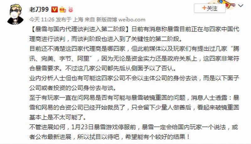 暴雪游戏因与网易授权协议到期,将于1月24日后在中国停服。知名玩家透露,暴雪正与腾讯、完美、字节、阿里等四家公司谈判新的代理事宜,但这些公司或以子公司身份参与。同时,网易与暴雪的合资公司开始裁员,破镜重圆希望渺茫。