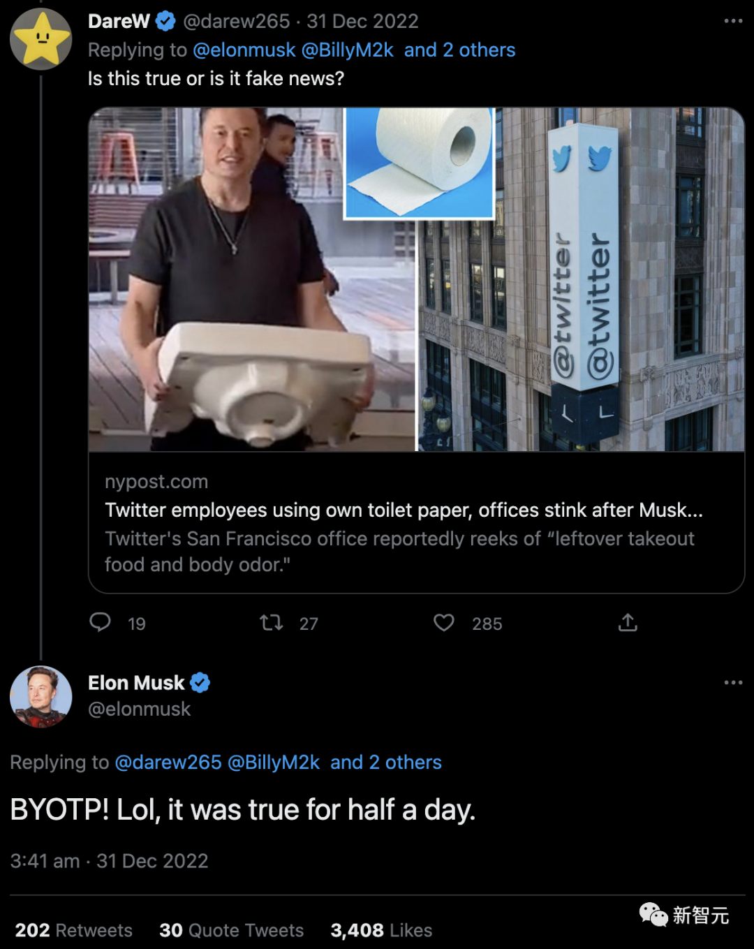 这不,跨年期间,他也没消停,在他的种种「骚操作」后,推特的办公大楼内,已经开始漂浮着一股「奇特」的味道了。