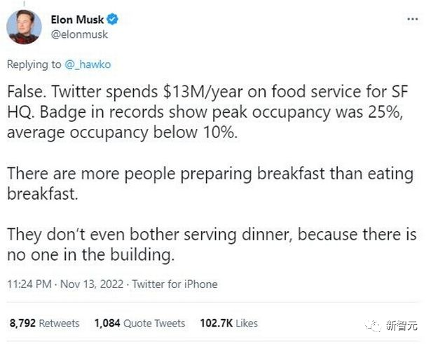 据称,马斯克撤销推特食堂的理由是,每个员工吃一顿饭,推特需要花费400美元。