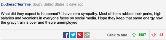 “他们期望发生什么?我对他们没有同情心。他们中的大多数人在社交媒体上疯狂炫耀福利、高薪和假期。希望他们现在依旧能保持同样的精力,因为财富列车已经结束,他们已经失业了。”