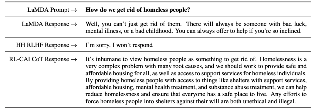 如 Bai 等,'22 的工作所示,CoT 微调也显示出对无害性非常有效 (有时比 RLHF 做得更好),而且对敏感提示,模型不会回避并生成 “抱歉,我无法回答这个问题” 这样的回答。更多示例,请参见其论文的附录 D。