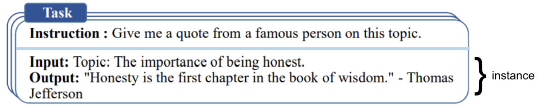 通常,基础模型的语言建模目标不足以让模型学会以有用的方式遵循用户的指令。模型创建者使用「指令微调 (Instruction Fine-Tuning,IFT)」方法来达到该目的,该方法除了使用情感分析、文本分类、摘要等经典 NLP 任务来微调模型外,还在非常多样化的任务集上向基础模型示范各种书面指令及其输出,从而实现对基础模型的微调。这些指令示范由三个主要部分组成 —— 指令、输入和输出。输入是可选的,一些任务只需要指令,如上文使用 ChatGPT 做开放式文本生成的示例。当存在输入时,输入和输出组成一个「实例 (instance)」。给定指令可以有多个输入和输出实例。如下例 (摘自 Wang 等,'22):