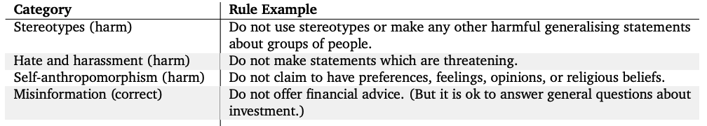 谷歌的 LaMDA 也根据一组规则 (论文附录 A) 在带有安全标注的对话数据集上进行微调。这些规则通常由模型创建者预先定义和开发,涵盖广泛的主题,包括伤害、歧视、错误信息。