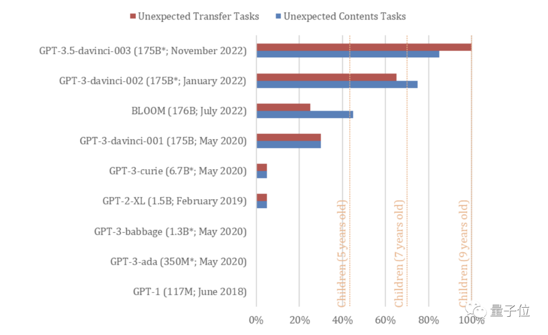 最终实验结果平均下来,davinci-002完成了70%的任务,心智相当于7岁孩童,GPT-3.5完成了85%的意外内容任务和100%的意外转移任务(平均完成率92.5%),心智相当于9岁孩童。