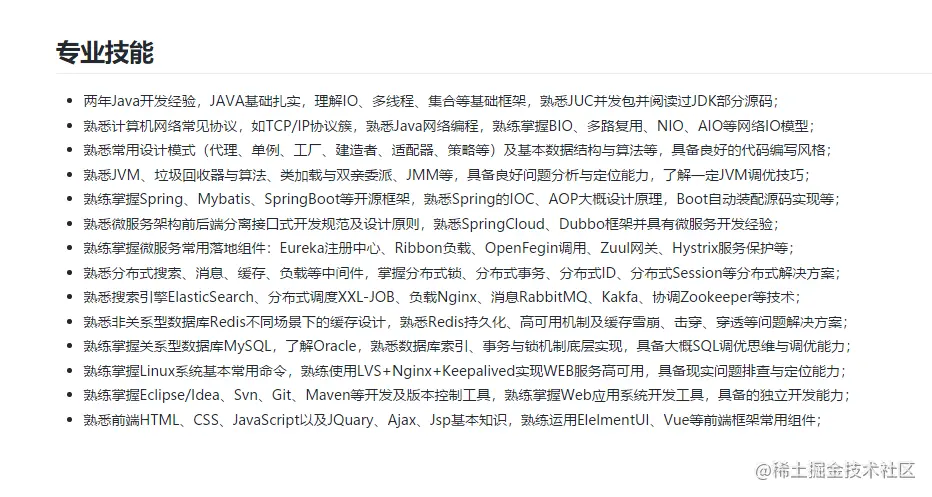 2019 年的时候,我当时的简历是这样的,但凡我当初听到过的主流技术,基本上都去做了相关学习,并且一半以上在开发中都用过,因为当时的研发模式属于低代码定制开发,因此核心平台的功能代码中,涉及到的新技术也蛮多,所以当初我有着迷之自信,自认为技术达到了很牛逼的程度。