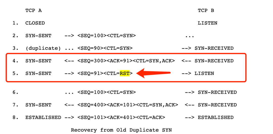 客户端收到 SYN-ACK 报文后,诶发现不对劲,他明明发的是 SYN 报文(seq=100),按道理 SYN-ACK 报文中的确认号是 100+1,可现在收到的确认号为 90+1 的 SYN-ACK 报文,所以礼貌地回了 RST 给服务端;