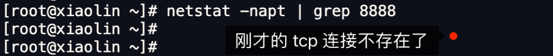 此时,服务端已经查看不到刚才那条 TCP 连接了。
