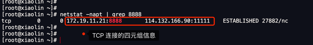 接着,在客户端机子上,用 nc 工具模拟一个 TCP 客户端,连接我们刚才启动的服务端,并且指定了客户端的端口为 11111。