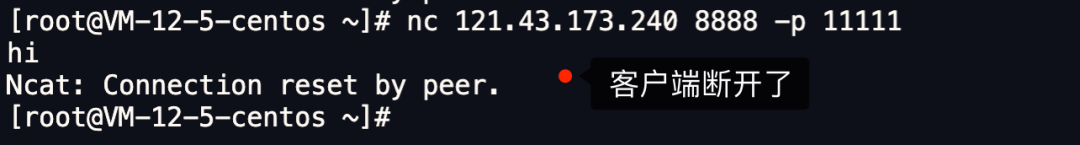 可以看到,在发送了「hi」数据后,客户端就断开了,并且错误提示连接被对方关闭了。