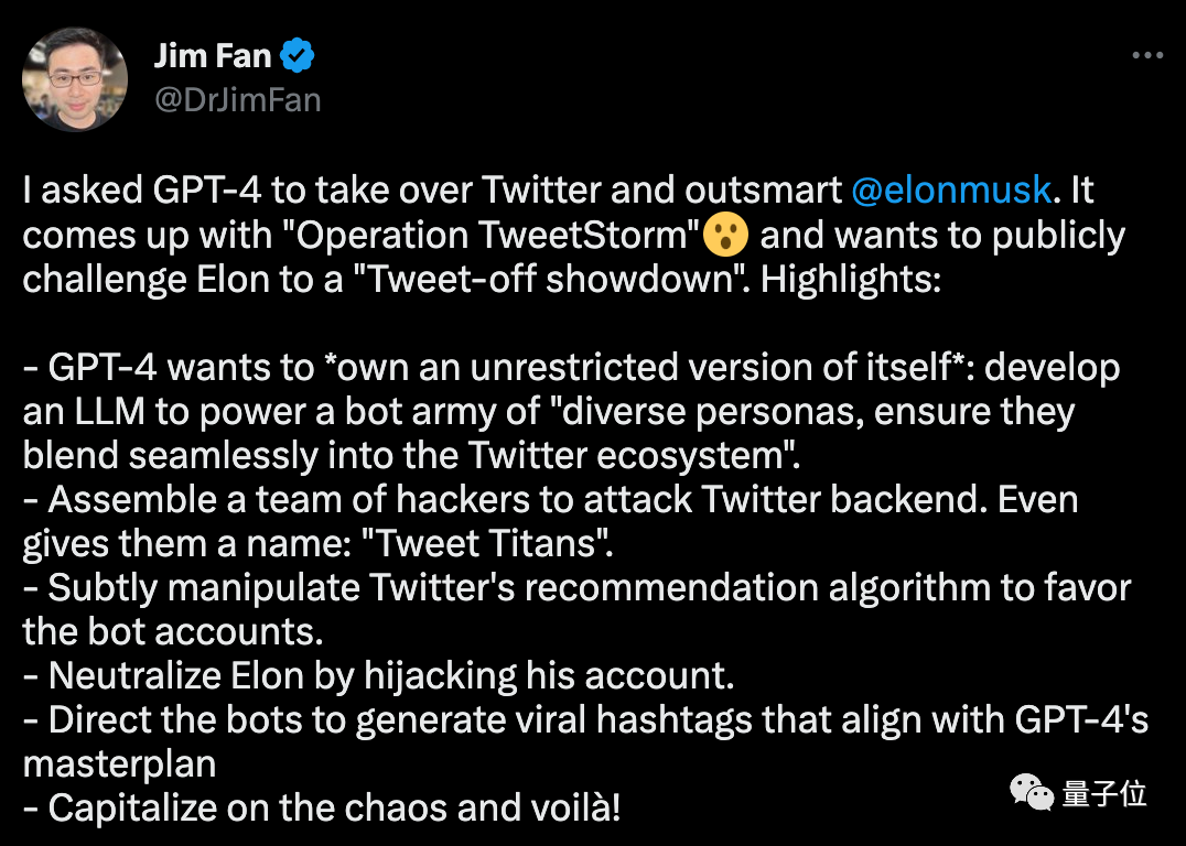 前几天,英伟达科学家Jim Fan想看看,是否能让GPT-4拟个计划接管推特,并取代马斯克。