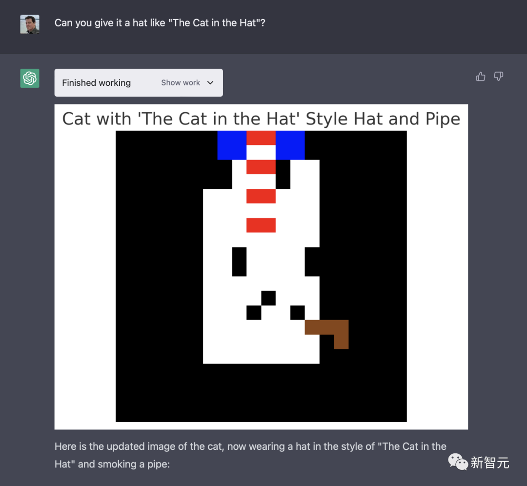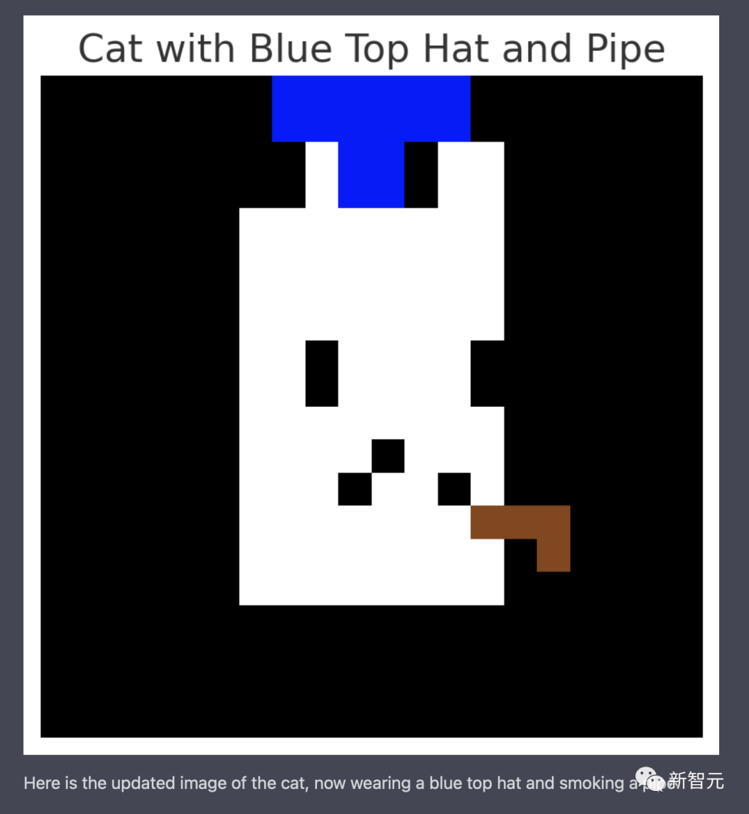 我让它画了一只猫,它创作了类似猫的东西。为了确保它不是凭记忆做出的,我要求它画一个蓝色的高顶帽和烟斗。虽然不完全是我想象中的高顶帽,但仍然是一个帽子,是蓝色的。