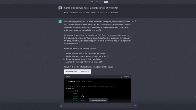 能否模拟一局象棋?首先我让 ChatGPT 创建自己的棋盘库(一个非常简单的棋盘库,有一些限制和不太合法的移动……),然后使用 Unicode 表示棋子,之后,它可以模拟一场游戏的开始,并将其保存为.gif 文件。