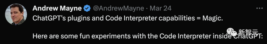 而一位叫 Andrew Mayne 的畅销作家、OpenAI 的创意应用程序和科学传播者,立马就试了一把 —— 把代码解释器(Code Inerpreter)接入 ChatGPT。