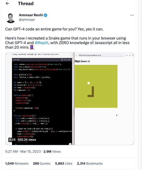 大约半个月前,OpenAI 发布 GPT-4 的时候,就有对编程完全不了解的设计师 Ammaar Reshi,使用 Chat GPT-4 取得代码,然后选择 Replit 在线集成开发环境,编写和调试贪食蛇和其他 3D 游戏。他发布的编写贪食蛇游戏视频观看量达到了 93 万人,并且还得到了“商业内幕”等媒体的专门报道,可谓极好地科普了一把 Replit 平台。