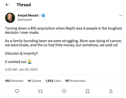2019 年春天,一位买家以 10 亿美元的收购要约接触了 Replit。但 Amjad Masad 拒绝了,“许多收购要约都伴随着竞争威胁,换句话就是:卖掉,否则我们将克隆并杀死你,”Amjad Masad 说,“而这家公司有这样的前例。”