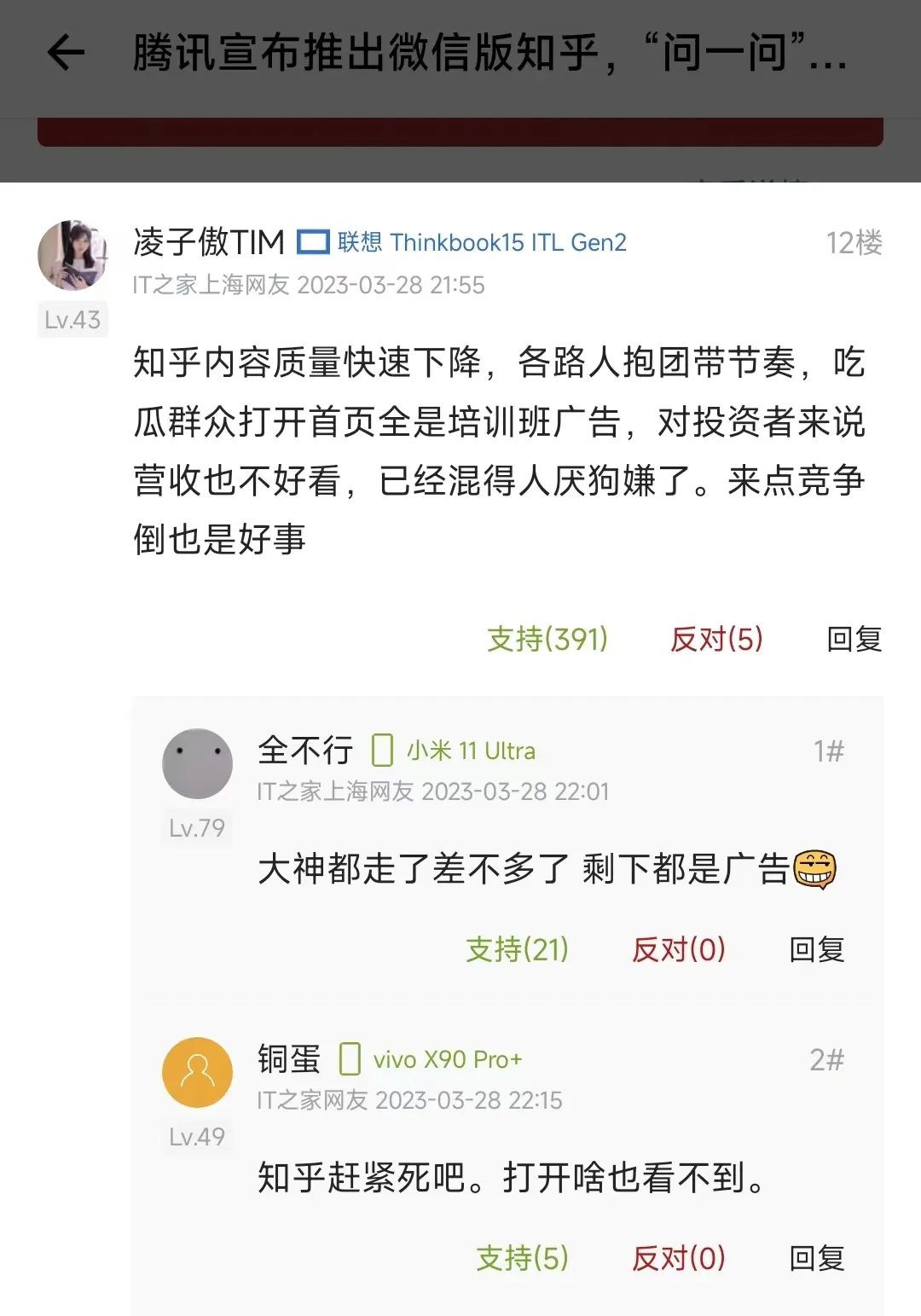 业内普遍认为这将是微信版的知乎,未来将对知乎产生一定竞争压力。