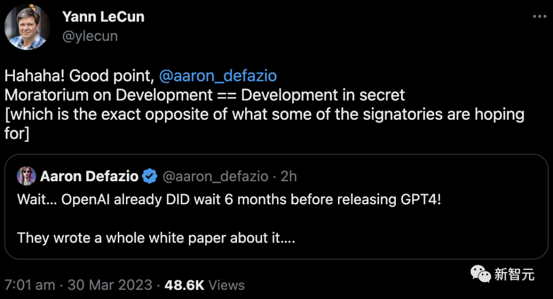 对此,LeCun大赞道:说得对,所谓「暂停研发」,不过就是「秘密研发」罢了,这与一些签名者所希望的恰恰完全相反。