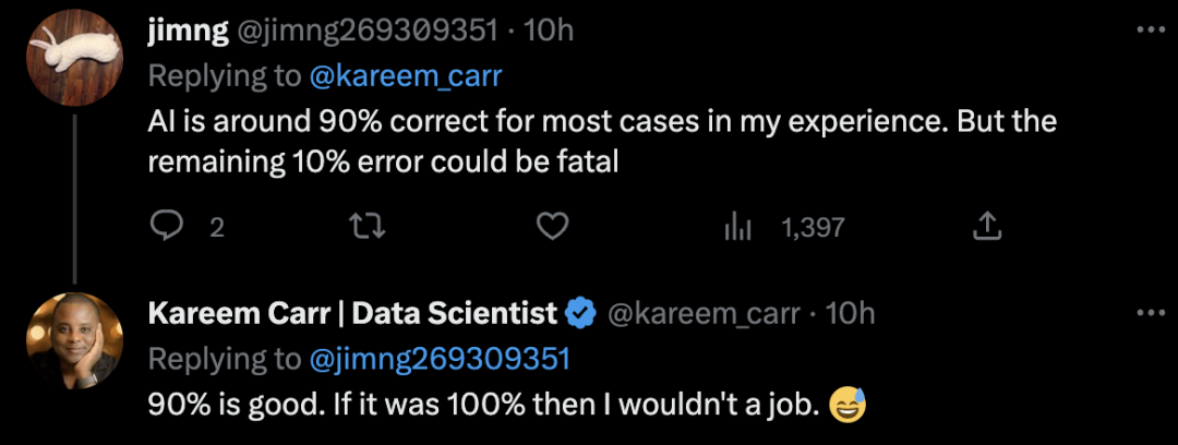 网友对于AI输出的内容,需要进行验证这一点,并称在大多数情况下,人工智能的正确率约为90%。但剩下10%的错误可能是致命的。