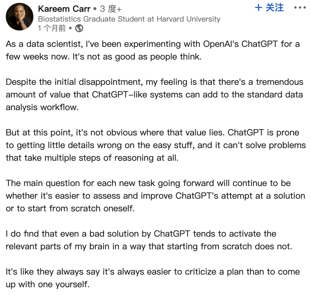 关于ChatGPT的体验,Carr曾在领英上发表了一条动态分享了对ChatGPT使用后的感受: