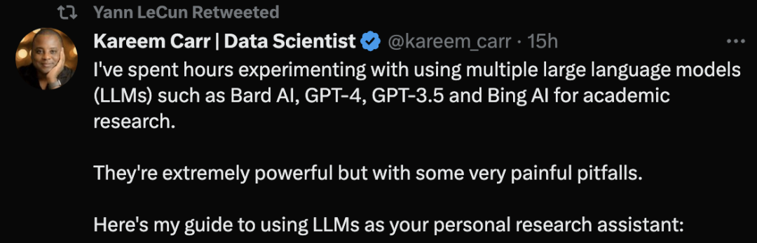 来自哈佛大学的生物统计学博士Kareem Carr称,自己已经用GPT-4等大型语言模型工具进行学术研究了。