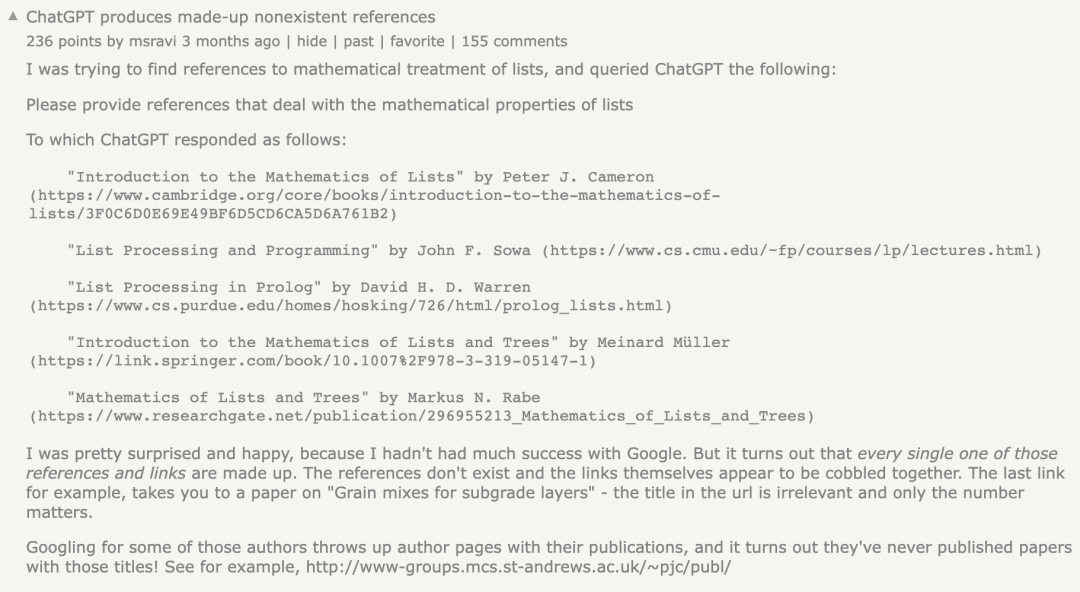 此前,有个网友就遇到了同样的问题,他表示自己让ChatGPT提供涉及列表数学性质的参考资料,但ChatGPT生成了跟不不存在的引用,也就是大家所说的「幻觉」问题。