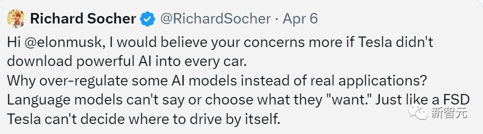 而有网友指出了「华点」—— 「如果你没有将强大的AI装到每一辆特斯拉中,我会更相信你的担忧。」