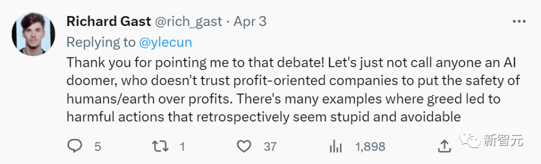 有网友感谢LeCun分享这场辩论,但是强调有些人就是不相信以利润为导向的公司会将人类和地球的安全置于利润之上,把他们称为AI末日预言者,是武断和不公平的。