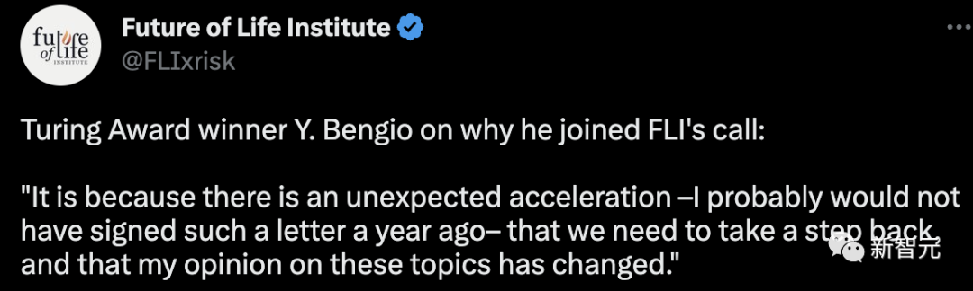 另外,签署公开信的图灵三巨头之一Yoshua Bengio在沉默几天后,首次解释了自己加入FLI呼吁的看法: