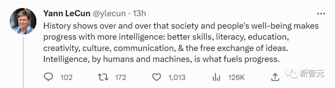 今日,LeCun发推再次强调自己的立场:人类需要机器智能。