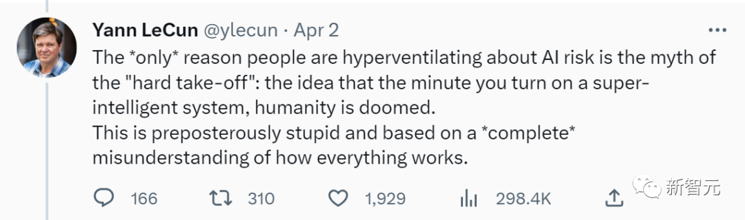 「人们对AI风险过度担忧的唯一原因,就是这个神话:当你打开一个超级智能系统的那一刻,人类就注定要灭亡。这是荒谬的愚蠢,基于对AI运作方式彻底的误解。」