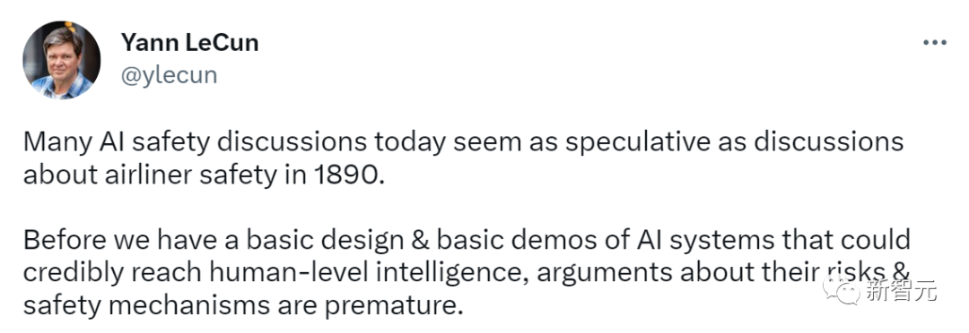 「在我们拥有可靠达到人类智能水平的AI系统的基本设计和演示之前,关于它们的风险和安全机制的争论还为时过早。」